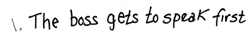 If the boss get first crack, then he’s going to set the agenda and the boundaries, and your brainstormer is immediately limited. I know of one Silicon Valley boss who eagerly launched a brainstorm saying he was looking for some great new ideas. But unfortunately he followed that enthusiasm with a room-silencing caveat: “Oh, and every new idea has to be patentable. And something we can manufacture.” In that setting, nobody is going to suggest anything even remotely “wild.” Try sending the boss out for coffee. Or doughnuts.